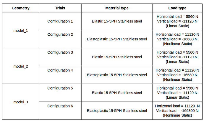 In the example, three models of the brackets are analysed with two different load cases each resulting in 6 configurations in total. One way to clearly show the different models and the loading conditions is as follows: