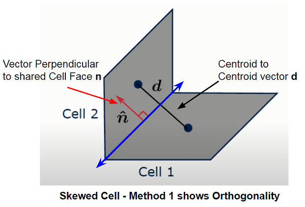 Non-orthogonality in method 2 is defined as the angle between the shared face vector n and the vector created from cell centroid 1 intersecting the midpoint of the shared face, given as vector c. This now allows for an accurate representation of Non-Orthogonality between these cells.