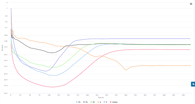 For the next run i am trying tighter relaxation factors, because after reading this A post from this thread: Most Popular Errors of Simulation - #3 by jprobst Johannes is saying that LOWERING the values of p,u,k, and w will help with convergence. I had thought that values closer to 1 help with convergence through the description from OPENfoam