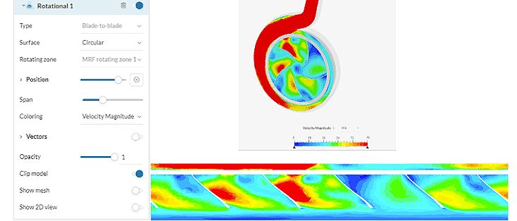A new post-processing filter, “Rotational,” enables blade-to-blade flow visualization in turbomachinery simulations to analyze flow through the cascade of blades. Users can analyze mesh, flow vectors, and contours on a 2D unwrapped plane of the blades, providing detailed insights into turbomachinery performance. The images can be exported. Also, the Meridional plane visualization is on our roadmap, so stay tuned!