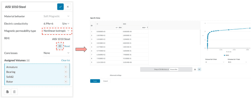 With this latest enhancement, users will also have more flexibility and precision in modeling magnetic materials. Whether a material’s magnetic permeability exhibits linear or nonlinear isotropic properties, our platform empowers users to accurately capture their characteristics. They can now upload B-H curves to define nonlinear isotropic magnetic permeability, offering enhanced precision in capturing material characteristics in electromagnetics simulations.