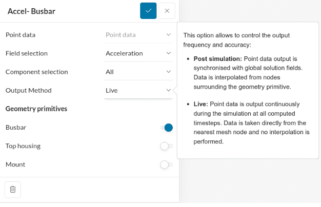 When the output method “Live” is chosen, every computed time step is also stored for the point data. In case the “Post simulation” method is chosen, the output of the probe point data is synchronized with the write control definition for the 3D result data.