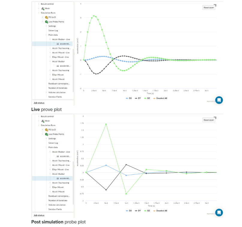 Below, you can see a comparison of “Live” probe results with a “Post simulation” result of the same Simulation, where the write control interval is much coarser than the actual simulation interval.