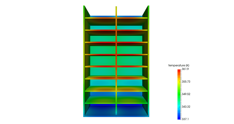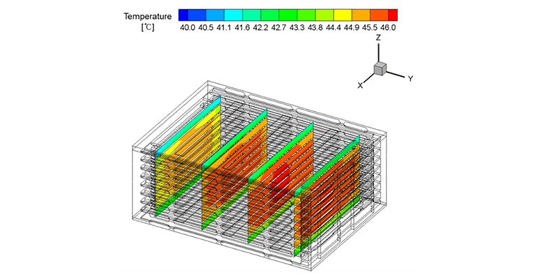 The performance and life of a battery is, among other things, affected by the battery design, the materials used, and the operating temperature. For battery packs used in electric or hybrid vehicles, the operating temperature (usually in the range of 20 °C – 35 °C) is critical to maximizing its efficiency. Operating at lower temperatures affects capacity, while higher temperatures deteriorate lifespan. Reports indicate that electric vehicles’ mileage could decline by as much as 60% when the ambient temperature drops below −6 °C and roughly 50% when operated at 45 °C. Another factor that affects the lifespan of battery packs is internal temperature distribution. A difference of more than roughly 5 °C in a cell / module (many of which can be inside a pack) reduces the overall lifespan as well as capacity. Fig. 01, shows the temperature distribution in a standard battery rack.