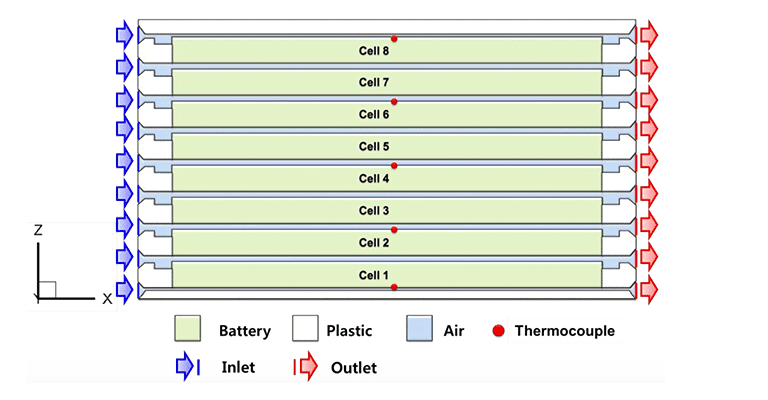 An example of successful CFD battery simulation can be found in the work of Yi, Koo & Shin in their paper “Three-Dimensional Modeling of the Thermal Behavior of a Lithium-Ion Battery Module for Hybrid Electric Vehicle Applications” published in the Journal “Energies”. The Li-ion battery module was set up as shown in Fig. 02.