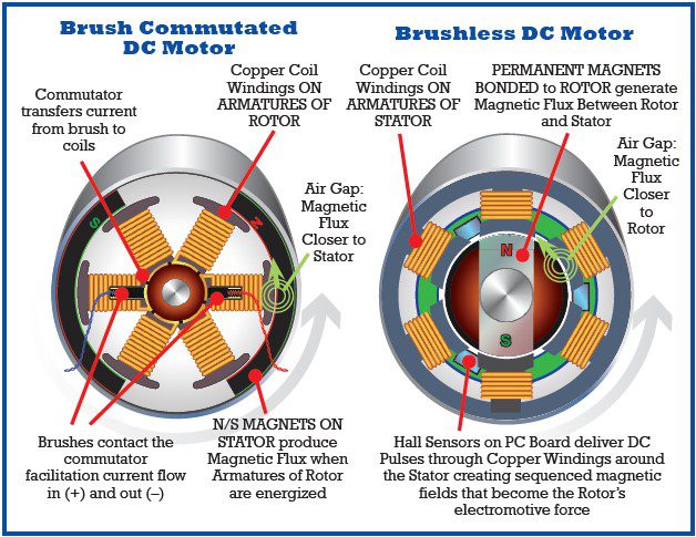 - Brushless DC motors are constructed in reverse. The rotors have permanent magnets attached to them, and the stator has windings. The stator’s magnetic field is rotated via control electronics rather than mechanical commutation. Brushless DC motors are known for their improved efficiency, reliability, and reduced maintenance needs.