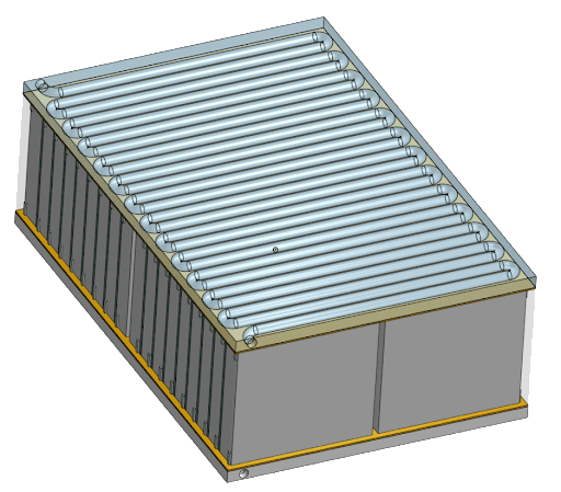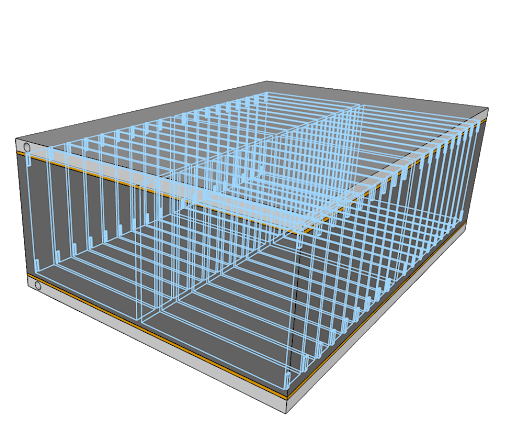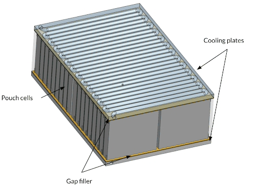 The model is a lithium-ion battery pack for electric vehicles that consists of four modules. We have two water cooling plates on the top and bottom of the battery module with the gap filler material separating the cooling plates from the pouch cells and the casing itself.