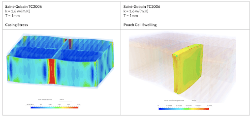 Gap fillers can outperform thermal pads in battery pack applications in terms of lower thermal impedance, as gap fillers conform to surface roughness before curing. What’s more, different materials can result in different mechanical performances. With simulation, engineers can investigate and post-process many aspects of thermomechanical design from casing stresses to pouch cell swelling and the impact on performance caused by drastic temperature gradients inside of the cells.