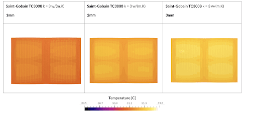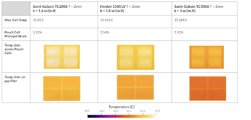 The first step of the study is to simulations with three different gap filler materials, each with the same thickness. Each material has a different conductivity value. We want to investigate the effect of using different gap-filling materials, in terms of the maximum cell temperatures that are observed inside the pouch cells. Additionally, we want to detect the amount of mechanical swelling that can take place due to the temperature in the pouch cells. Increased conductivity results in reduced maximum cell temperature, however, change in conductivity had a minor effect on our study, since the dominant impact on reducing temperature was provided by the water cooling plates. Even these minor effects are valuable to note in the early-design stage, however, as the material selection impacts cost in manufacturing.