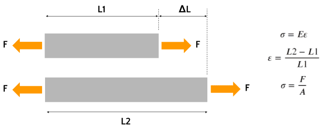 When trying to write Hooke’s law in terms of material stress, one notices that the elongation of elements is not a consistent measure. If the geometry of a test specimen (e.g., for a uniaxial test) is changed, then the rigidity constant does not generalize for a given material. A special measure of deformation should be considered. This is known as the material ‘strain‘ and has a few different definitions, such as ‘engineering strain‘ or ‘true strain.’ These definitions allow us to state a relation between the material’s stress and strain, using a measurement of the material rigidity known as Young’s modulus.