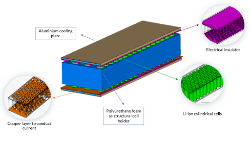 The cooling performance assessed in the project shown below includes the maximum temperatures reached by the battery pack cells, as well as the battery gradient, which is essential for optimal battery performance. The parameter studies included a variation of the inlet flow velocity as well as the thermal conductivity of the electrical insulator.