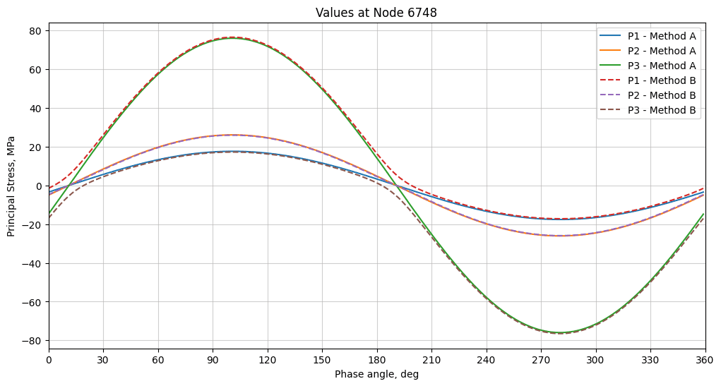 - “Method B” – This method makes no assumptions about the principal stresses, and works by first obtaining the phase history of the stress components, then forming a real stress tensor at each point in the history. The eigenvalue problem is solved at each point to yield the history of the principal stresses.