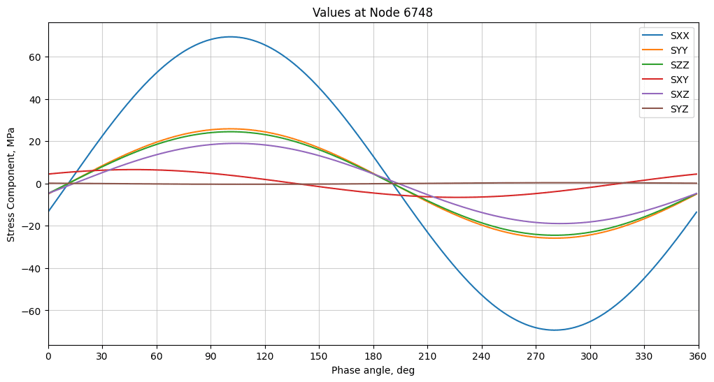 First, we see the phase sweep expansion of the stress components, appreciating the harmonic functions, peak values, phase angles, etc.