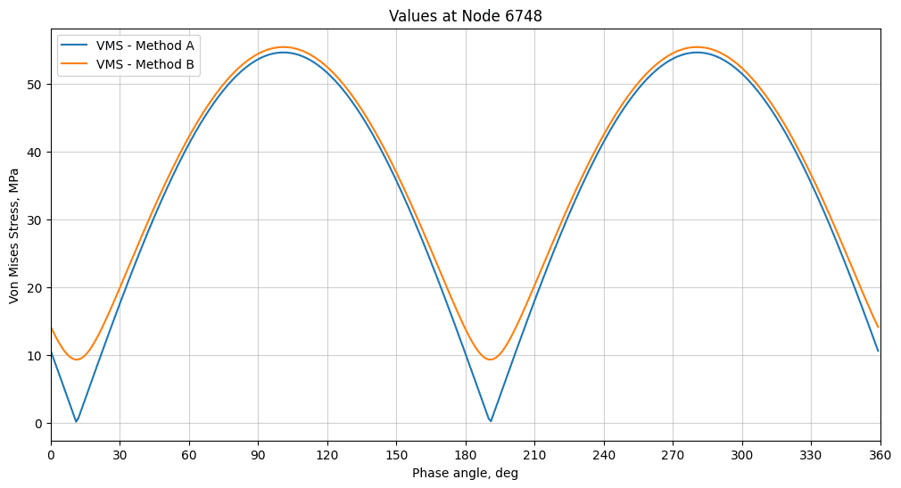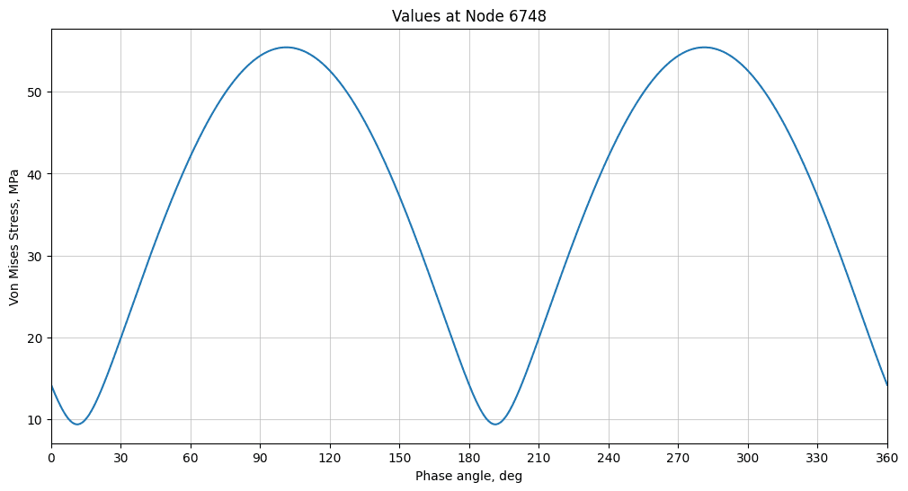 The core idea is to perform a ‘phase expansion’ of the stress components’ histories and then compute the derived quantities, such as the von Mises stress, for each point in the history. This ‘brute force’ approach is completely different from the methodology implemented in the platform and should provide quality reference results for comparison.