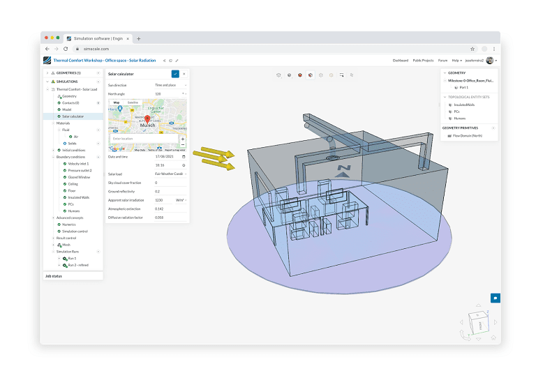 Professionals in the Architecture, Engineering, and Construction (AEC) industry understand how critical their building designs are to the comfort of occupants and building energy performance. Solar radiation has a significant impact on the thermal aspects of buildings and structures, in both internal and external environments. SimScale has now empowered architects and engineers to model the impact of solar radiation and heat gains directly through our CFD simulation platform. This new feature allows users to visualize solar heat loads on the inside and outside of building models and boost the accuracy of thermal comfort predictions.
