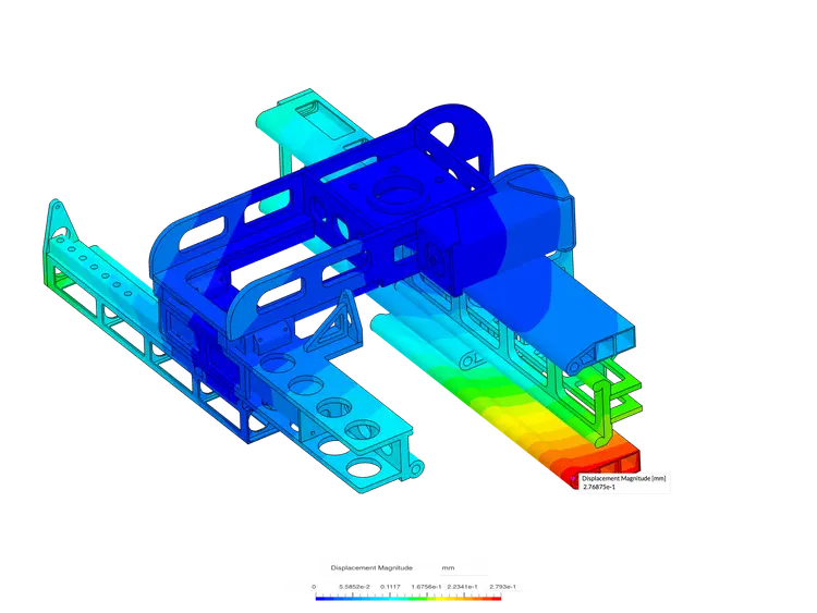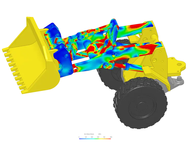 The example below is a structural analysis of a wheel loader arm. This simulation project enabled the design engineer to study the relative movement between the components and assess the stress performance simultaneously. This assessment was done by calculating the Von Mises stress distribution within the arm. Such an approach almost eliminates the need for physical prototyping in the early stages of the design process.