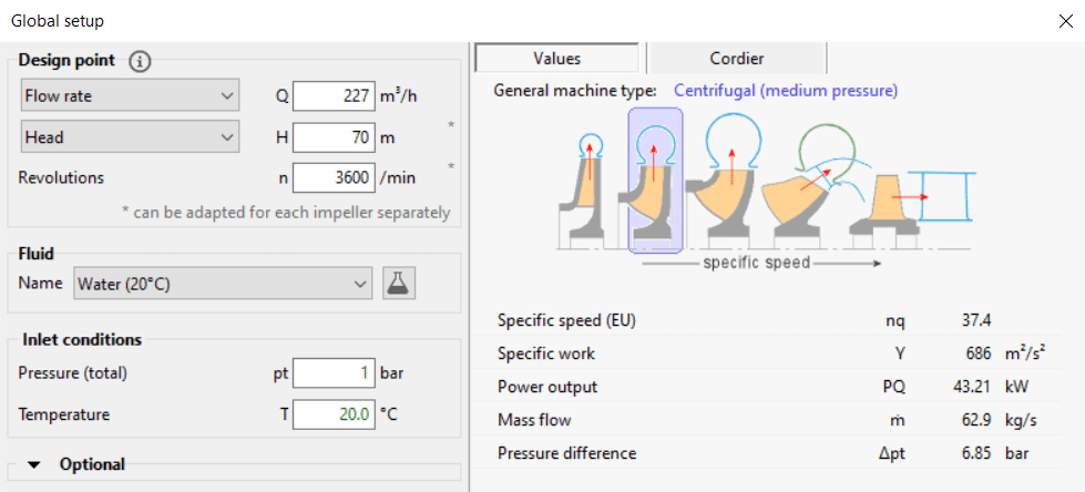 An end-suction close-coupled (ESCC) centrifugal pump is designed in CFturbo. The following design features and operation requirements of the pump’s design point, or best efficiency point (BEP), are used as inputs to rapidly create the pump design from scratch: