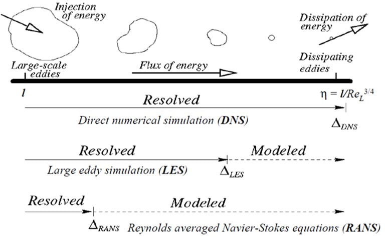 LES: An average turbulence model between DNS and RANS in which filtered Navier-Stokes equations are used for large-scale eddies. An appropriate model is preferred to solve small-scale eddies.