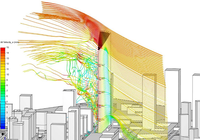 The analysis quantified the relative benefit of these slots to reduce the overall wind forces but also helped position vertical axis wind turbines within the slots to maximize the renewable power production of the proposal. The combination of these form optimizations and detail elements gave the building its distinct and iconic form and reduced the relative wind forces by approximately 35% from the baseline.