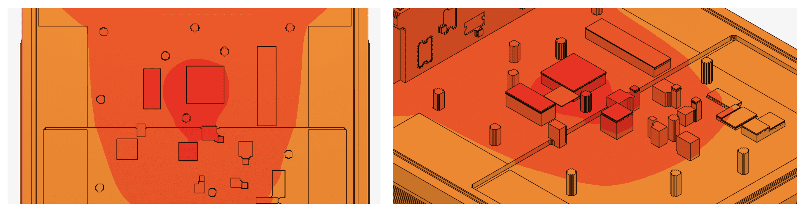 In the initial use case, our primary objective was to analyze the performance of the processor in extreme conditions, where the sole mode of heat dissipation is natural convection with no air flow. Initially, we designed the thermal management system based on hand calculations to obtain a rough estimate of the sizing. The design principle revolved around enhancing the thermal pathways to facilitate efficient heat dissipation from the processor. Subsequently, we incorporated the simulation tool in the following step, subjecting the initial design to rigorous simulation across multiple test scenarios. We meticulously analyzed the thermal contour of the component, paying close attention to temperature data at various probe points. The image below illustrates the thermal contour of the analyzed component.