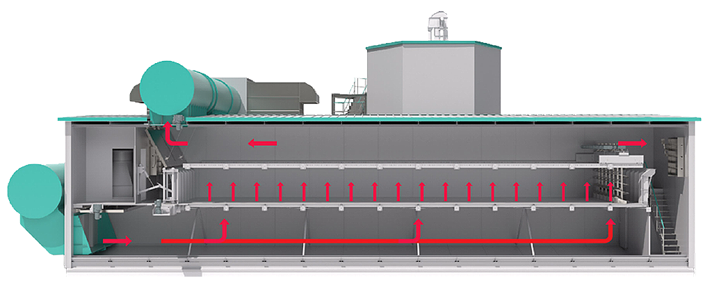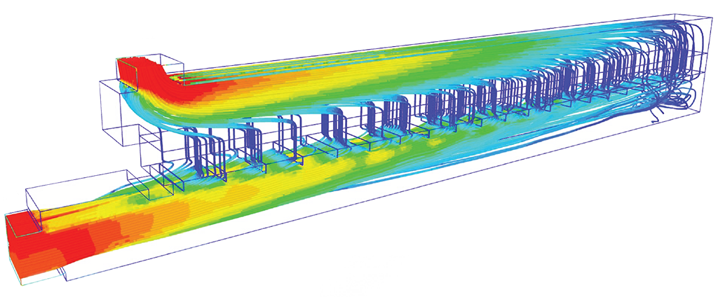 Flow simulations are performed on an industrial-scale malting facility. CFD flow simulation through a standardized modular malting plant with annual throughput of between 1,000 tons and 17,000 tons of malt is shown in the image below. CFD is used to model the fluid flow and optimize flow speeds and pressure losses throughout the process. Simulation allowed them to scale the malting plant without costly and time-consuming pilot plants of different sizes being built and tested.