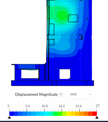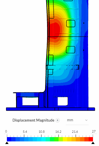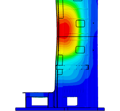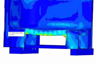 The team also checked that the reinforcements in the walls were strong enough and the walls did not begin to deform up until a certain load point. In the end, the team found that it was correct to add an additional reinforcement as the analysis showed too much deformation in the box pallet walls. By using simulation to evaluate options quickly the team was able to add 50% loading capacity to the bin by quickly simulating various structural support additional to the walls. A redacted version of the proprietary design is shown in the simulation images below.