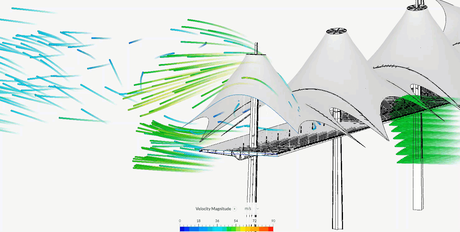 Doron ran simulations considering both the transversal and longitudinal flow across the bridge. Each simulation taking about 50 minutes to complete and 0.4 GPU hours. The pressure loading across the protective canopy was of key concern as any compressive loads would cause it to buckle and flap in the wind, decreasing its life span and generating additional structural loads on the structure.