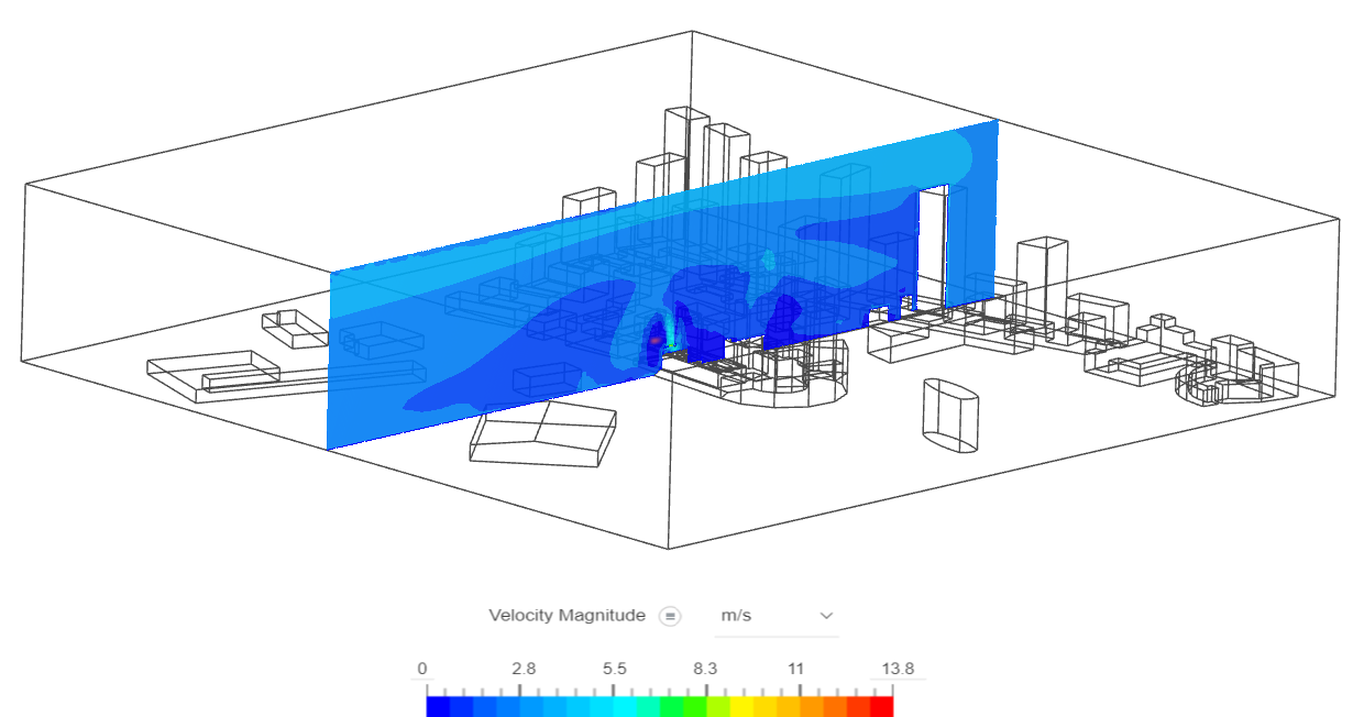 CFD simulations using SimScale were conducted to provide confidence to the client and planning authority that the proposed energy center would not pose a risk of cold discomfort and visible plumage that would be deemed unacceptable in the local community. CFD was also used to mitigate negative impacts such as pedestrian cold comfort, and adventitious sheltering of local buildings, ensuring proper dispersion into the atmosphere.