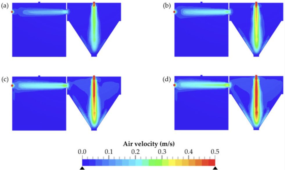 Fette Compacting used computational fluid dynamics (CFD) to analyze the flow and air mixing behavior of the contaminant dust in the chambers, including the mechanism of transport between the two chambers and deposition onto a machine operator. The results were compared to in-situ physical data from the chamber and the IOM filter data that represents the risk to machine operators. The key outputs from CFD were air velocities, mixing efficacy, and residence time of the dust particles in the chamber. CFD was used to determine the evacuation time or residence time of the dust in the chambers. A time period of 9 min was sufficient for a reproducible evacuation and reliable detection of most airborne particles within the detection chamber. Comparisons to actual measured data using smoke tests showed a high degree of validation of the CFD setup.