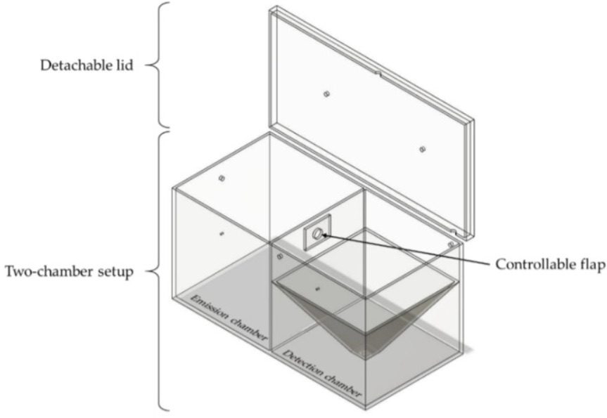 This is where the dual-chamber model comes into play. The apparatus is divided into two areas separated by a closed flap. In the emission chamber, a reproducible negative pressure overpressure is used to first atomize a small amount of powder. After atomization, the chambers are connected by opening the flap for one minute, when a certain amount of the powder dust passes into the adjacent detection chamber. There, the particle concentration of the ambient air is determined by a measuring device installed at the bottom of the chamber.