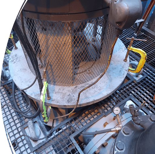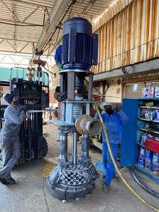 A large pump (about 9 tons in weight) was having vibrational issues at 800 rpm. Workers on-site added clamps to the motor bracket in the attempt to stop or limit the vibration and were only partially successful in doing so. Independent consulting engineers were hired on-site to try and understand the root cause of the vibrations and find a plausible solution. The pump in its installed environment is shown in Figure 5 below.