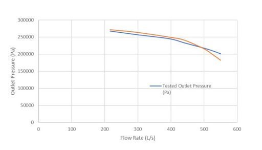 The third pump design of interest to Hazleton was a large 250 kW vertical pump, which in fact could not be tested on-premises and had to be taken to the South African Bureau of Standards (SABS). Each physical test at SABS cost Hazleton about $3000, not to mention the increase in time to market. With SimScale, they were able to simulate the same pump, from pre-processing to generating performance data, in only 23 minutes. When the accuracy of the simulation data was found to be within a 3% error margin of the SABS test data, as shown in Figure 4 below, it became clear to Hazleton that they could confidently replace expensive physical prototyping with simulation-driven design in SimScale for all their future pump designs.