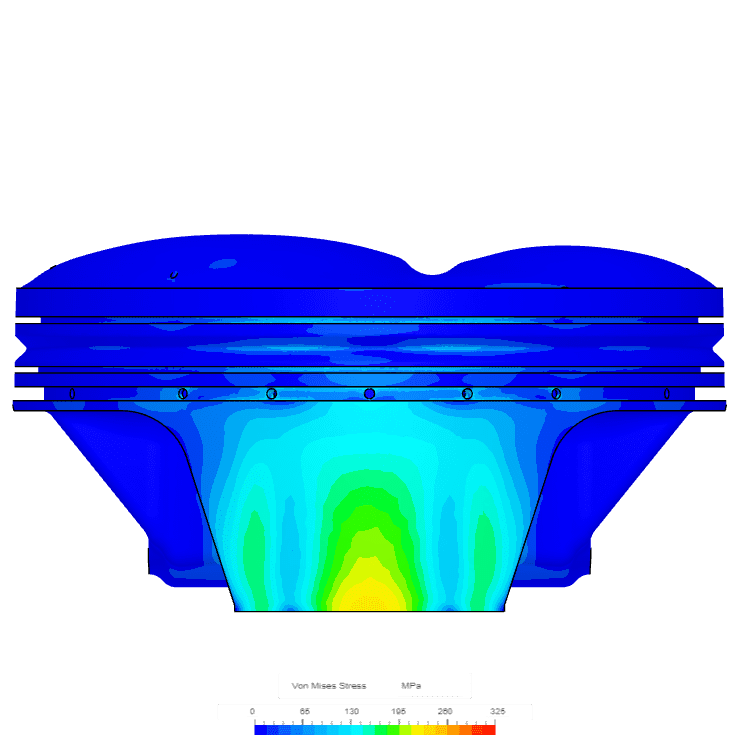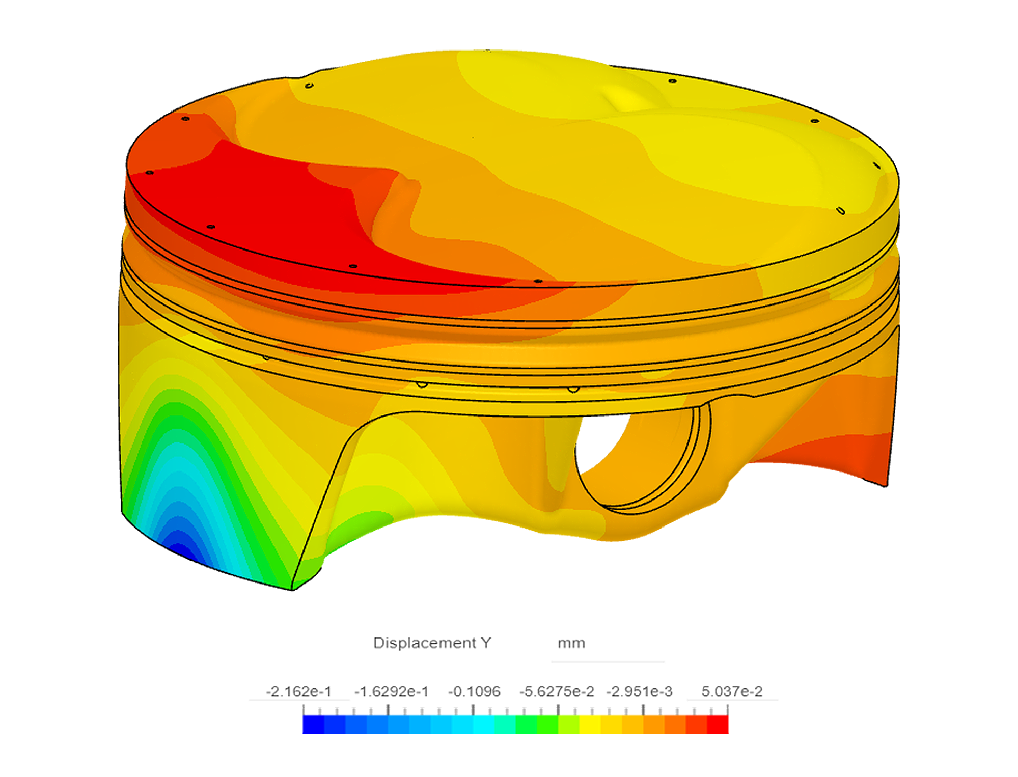 Ilmor designs and manufactures a myriad of high-performance, high-precision parts including pistons. The images below show a series of structural and mechanical analyses performed on an aluminum piston. Under various loads and forces, Ilmor can evaluate the stresses and displacement in the structure of the piston to make sure it complies with performance targets and the expected duty cycle. Once the simulations have converged on an acceptable design, it then progresses to the physical prototyping stage. By simulating early and often in the design process, Ilmor can disqualify poor design candidates at a much earlier stage of the design process and save time and cost during testing and manufacture.