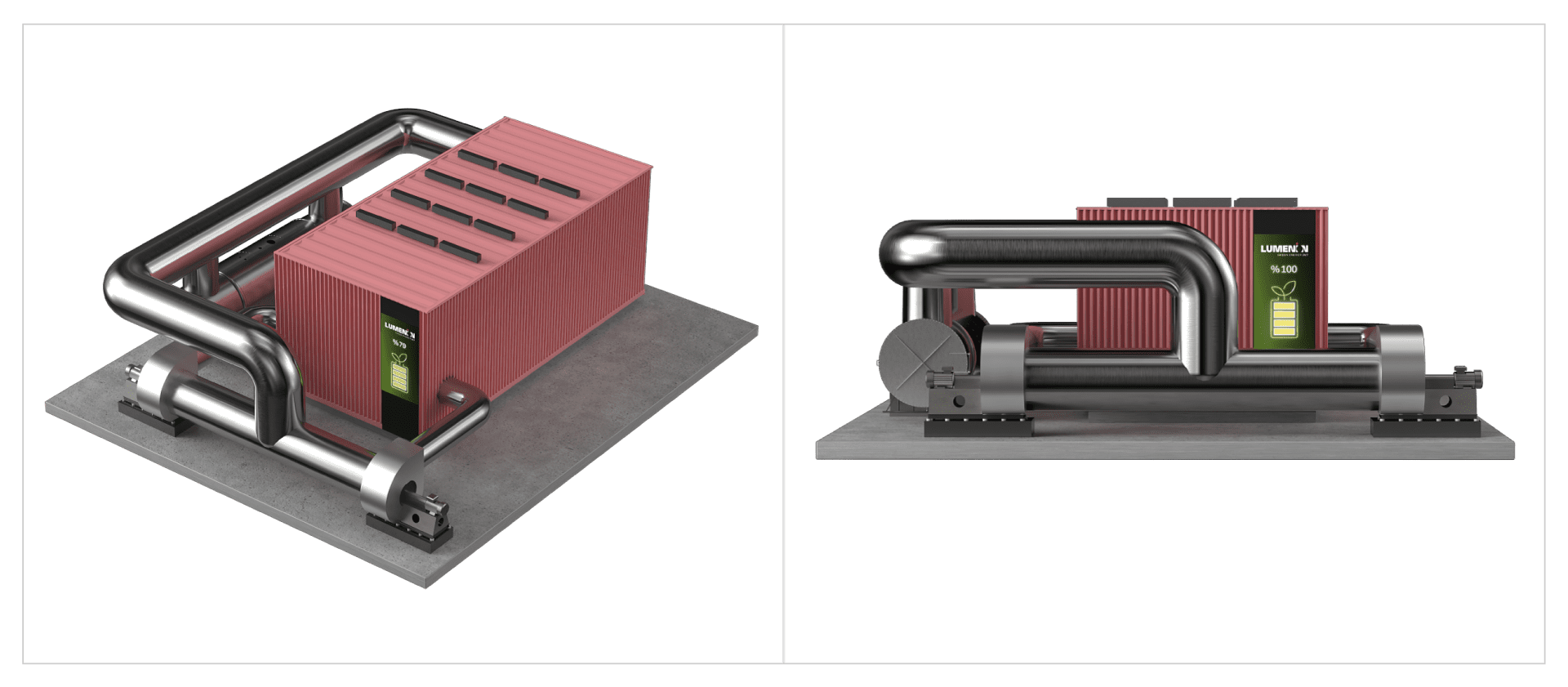 LUMENION TES is a complex system with many critical components including the steel core, ducts, fans, pumps, pipes, valves, coolants, electrical heaters, and steam generators. The system operates at very high temperatures and is considered critical for safety purposes in a highly regulated power and utilities industry. The steel core is a labyrinth heat exchanger core made of structural steel. The core can be completely charged in four hours and based on demand can have slow/fast discharging depending on the load demand. The easily available, high-temperature industrial fans blow air through the system to transfer hot air from the core to the steam generator which converts water to steam. The overall system is 95% efficient with 5% standby losses per day and an operating efficiency of 90%.