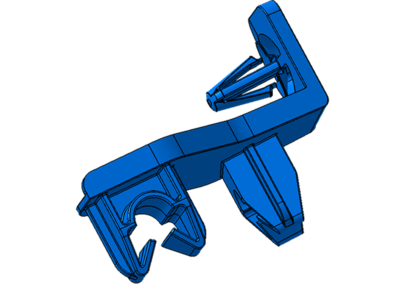 In this example, an automotive engine bay fastener used to connect pipework to metal housing is simulated and optimized. The product includes two types of clips, an anchor clip (A) and two pipe clips (B). Prototype designs are created in a short (X1) and long (P1) anchor configuration. The short X1 prototype failed physical testing requirements due to a high introduction force during insertion. The entry force thus needs to be decreased by 10-20% to enable easy insertion without any damage to the anchor clip itself and to maintain a strong snap. The anchor length was increased by 5 mm in P1 (long anchor).