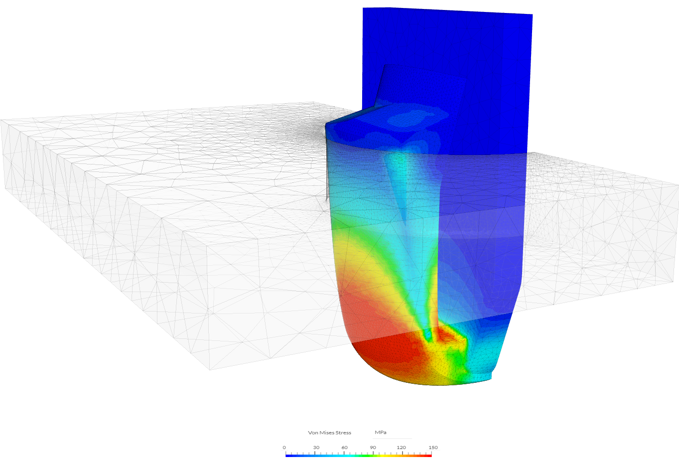 Insights from the first iteration show peak stresses and introduction force during the insertion process (Red denotes high stresses). The long anchor P1 drastically reduced the insertion force by 85% and this was replicated in physical laboratory tests.