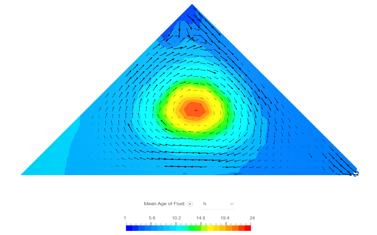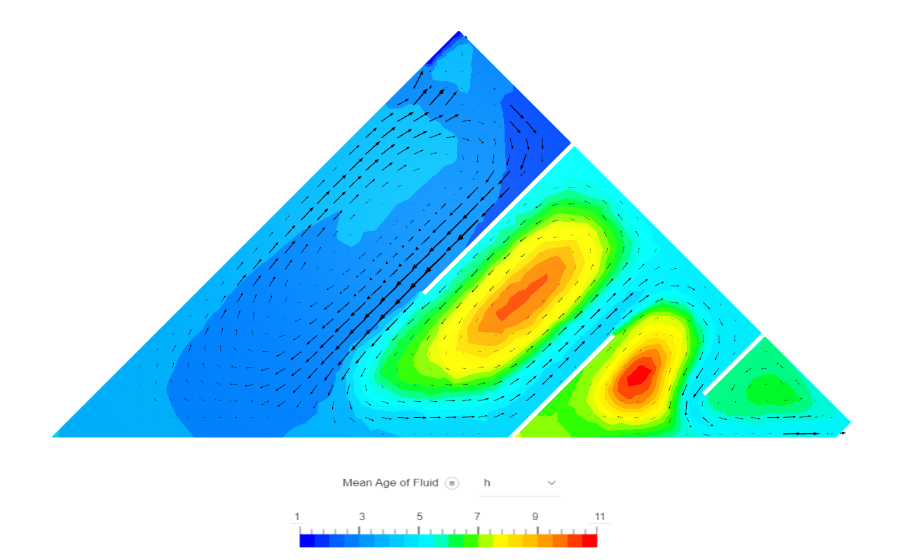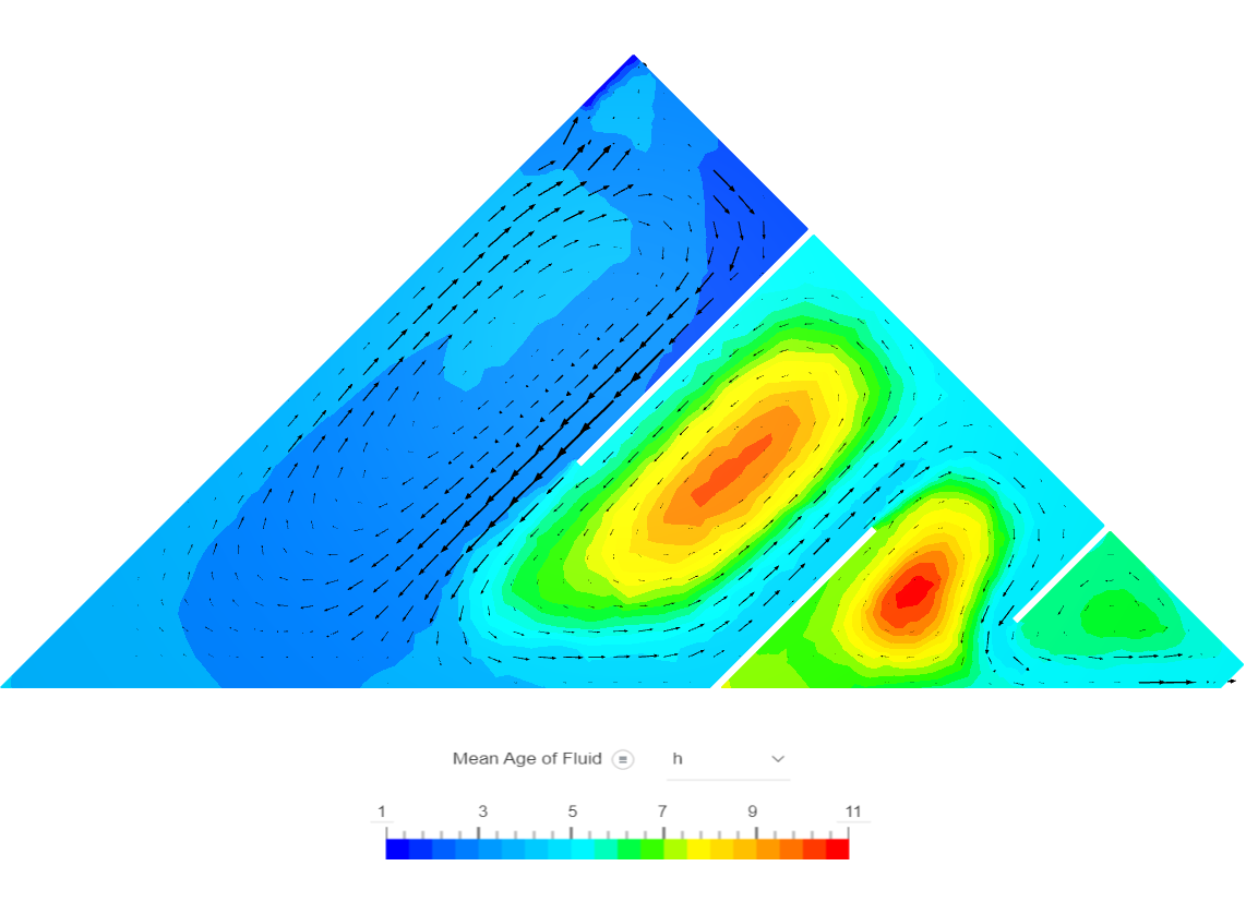 The best-performing baffle configuration (V4) avoided short-circuiting, reduced dead zones by 30% (Compared to V1), and lowered mean water (Fluid) age by 50% from 24 hours down to 11 hours. The final design required minimal material for baffles, reducing construction costs while meeting performance criteria. The triangular tank geometry maximized autonomy and operational efficiency within the limited site footprint, and the use of simulation clarified the final solution at an early stage and mitigated the risks of adopting an irregular shape for the tank.