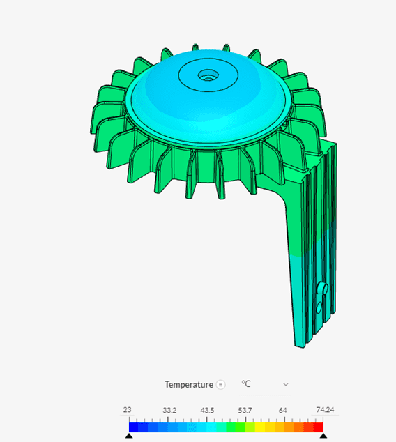 To start this project, Kichler created a baseline prototype of a new design which was used as a control sample. They simulated the prototype and found the simulated temperature readings were within a 6° C tolerance of what they might expect which was considered adequate. This initial prototype was the first design iteration and had a reduced volume of 3,000 mm3 via channels on the back of the heat sink giving a max heat sink temperature of 74.24° C and an outside module temperature of 44.4° C.