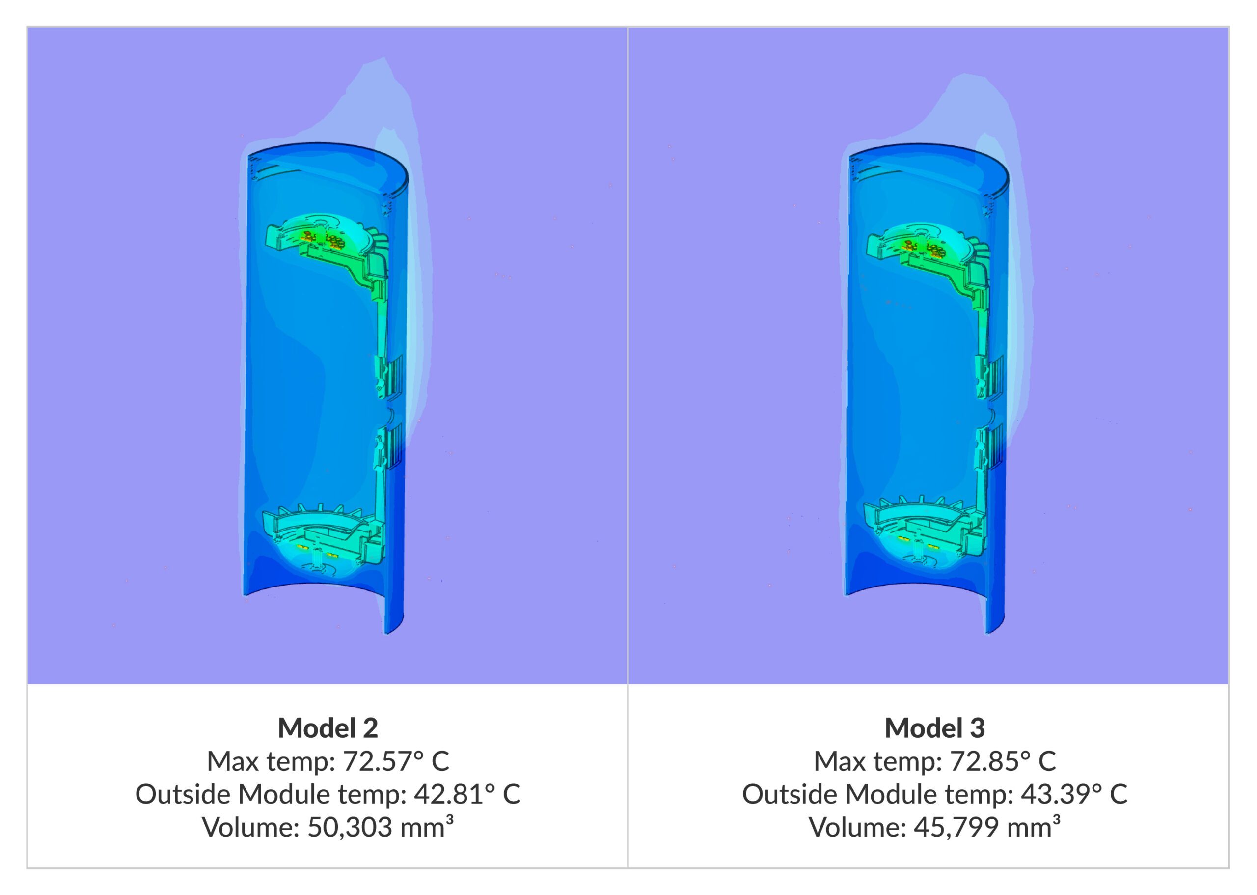 The final model yielded slightly higher temperatures than the control sample but still below the product constraints even when adding back 10-15% for simulation discrepancies. The total volume for the final model was 32,800 mm3 and given that two heat sink components are in each fixture, that adds up to 51,300 mm3 in savings or 139 grams of aluminum per LED fixture. The current final model is being fine-tuned to make it manufacturing-ready.