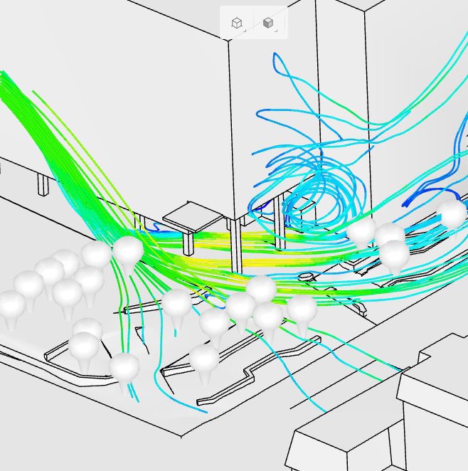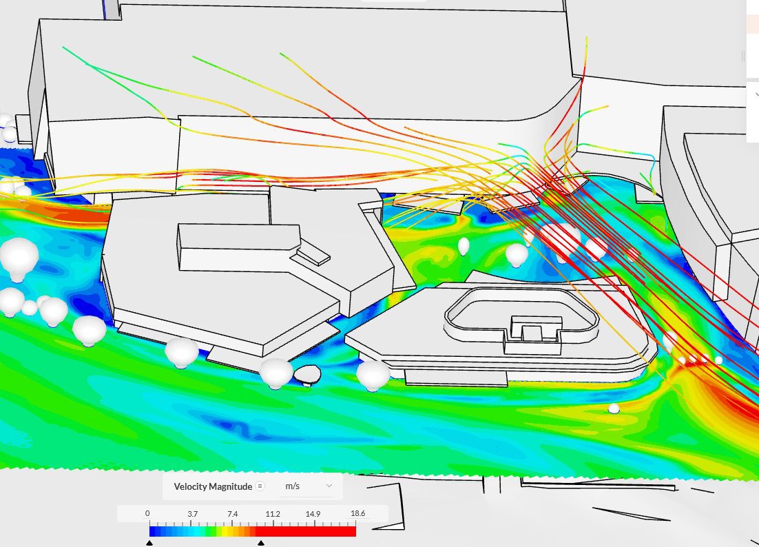 In the same project, Meteorology Solutions tested scenarios for emergency helicopter downwash to ensure it would not significantly impact an outdoor area between buildings and below the helipad. See the figure below for an example.