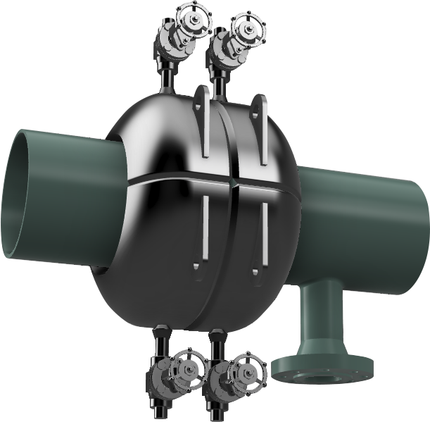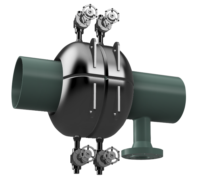 The solution shown in the images is a well enclosure clamp box to contain the leak that had developed in the weld adjacent to a flange. The leak’s location was considered extremely tricky to reach, and the plant operators could not get a traditional leak-stop services company to come out and repair the leak in the desired time.