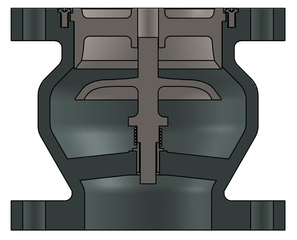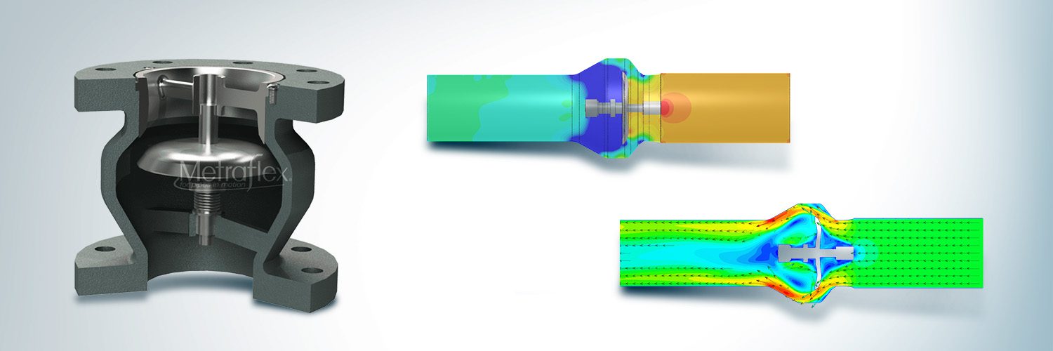 The Metraflex Company has developed the first center-guided silent check valve specifically designed for use with a variable frequency drive (VFD). The team at Metraflex has accomplished this by reengineering a traditional and long-ignored hydronic component to improve its efficiency and lower operating costs. The new VFD check valve improves overall performance by increasing the flow rate through the value due to reshaping the disk. By examining the new disk design it is obvious why this product is more hydrodynamic, and its enhanced performance is validated using flow simulation in SimScale and laboratory testing. In addition to the increase in flow coefficient (Cv), the new hydrodynamic disk is specifically designed to provide superior functionality in low flow conditions common with VFD drives.