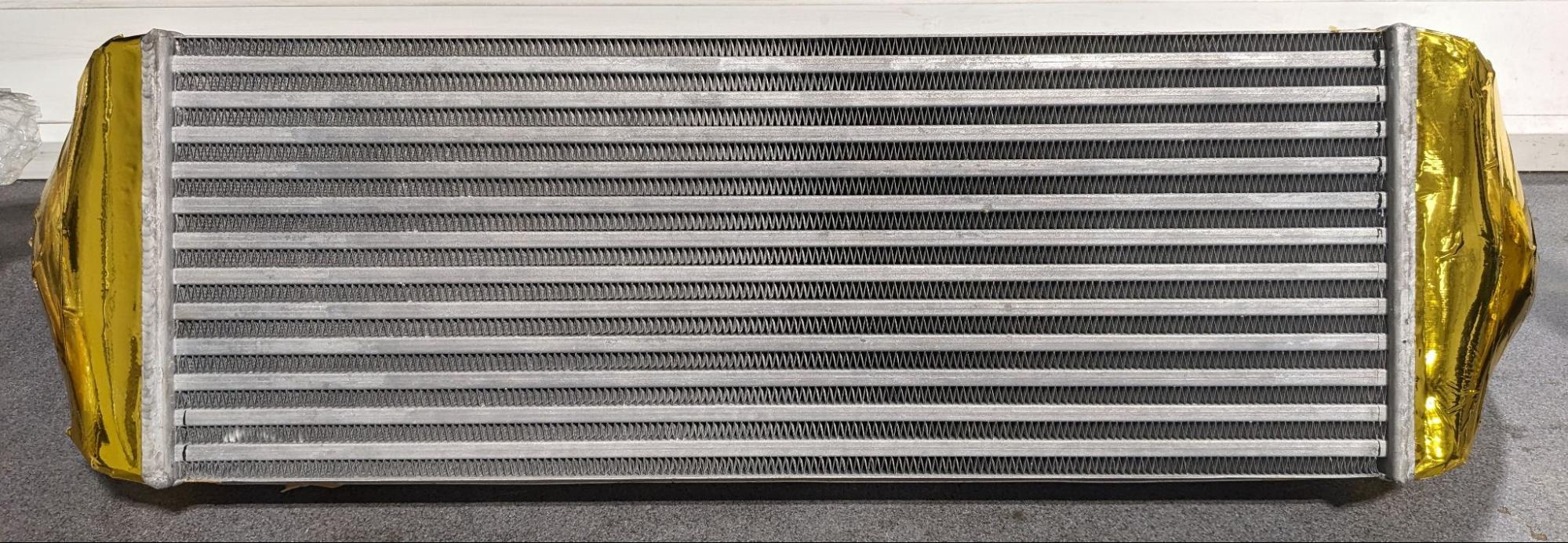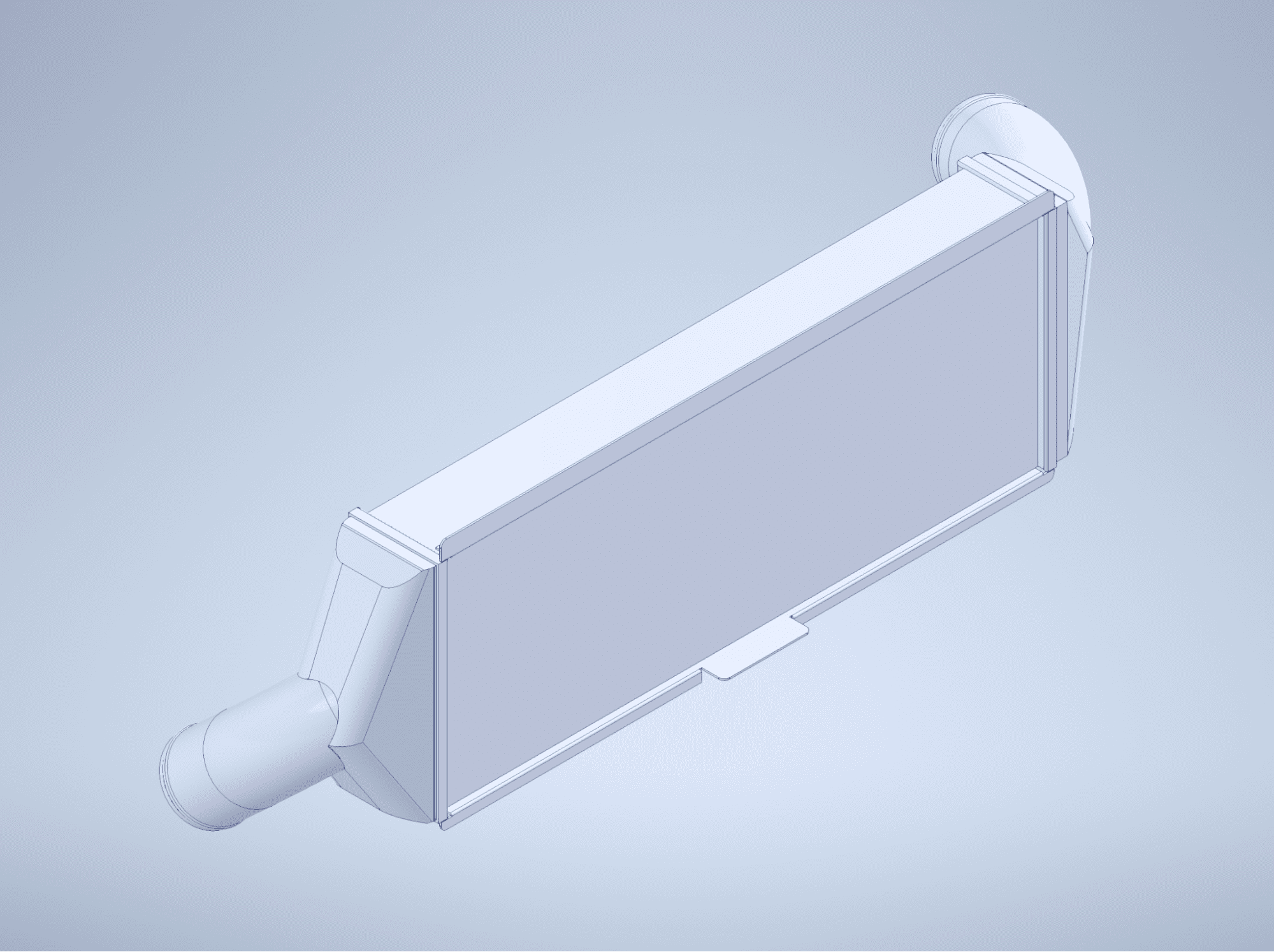 The images below show the original duct design, which gives a non-uniform and turbulent airflow toward the top of the duct where the intercooler sits. The duct exit face is approximately 550×200 mm, which meets flush with the face of the intercooler. The duct depth is only 70 mm, and at duct intake air speeds of 90 mph, the intercooler was only managing to achieve 0-45% airflow coverage over the radiator core, which has a water/chemical mixture as the coolant.