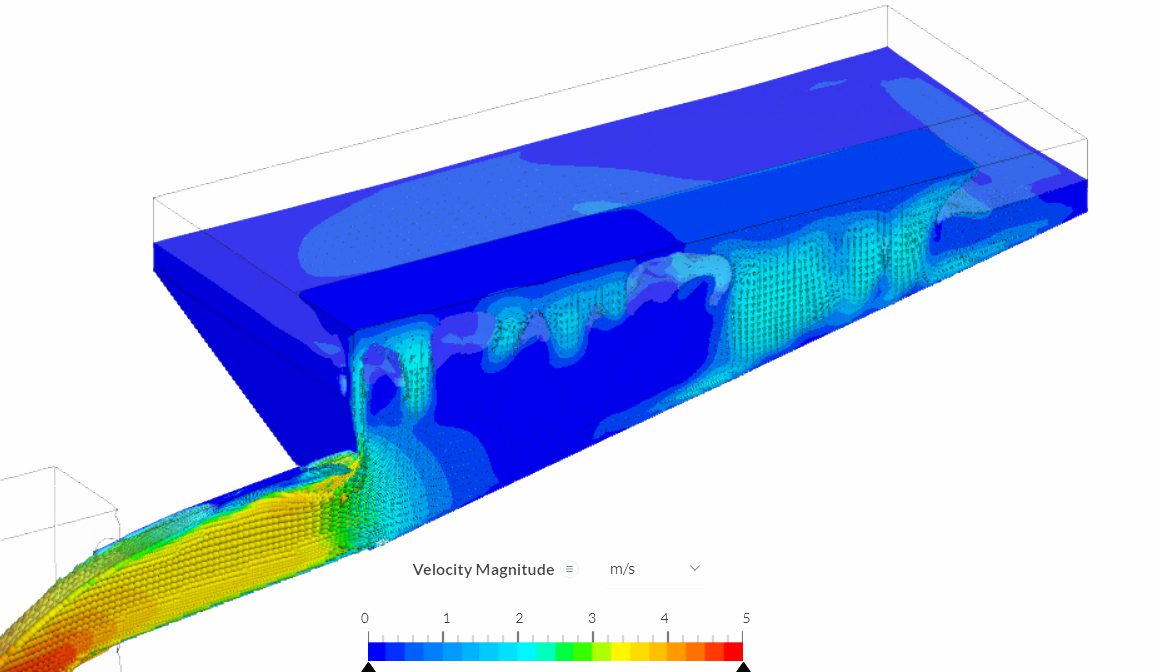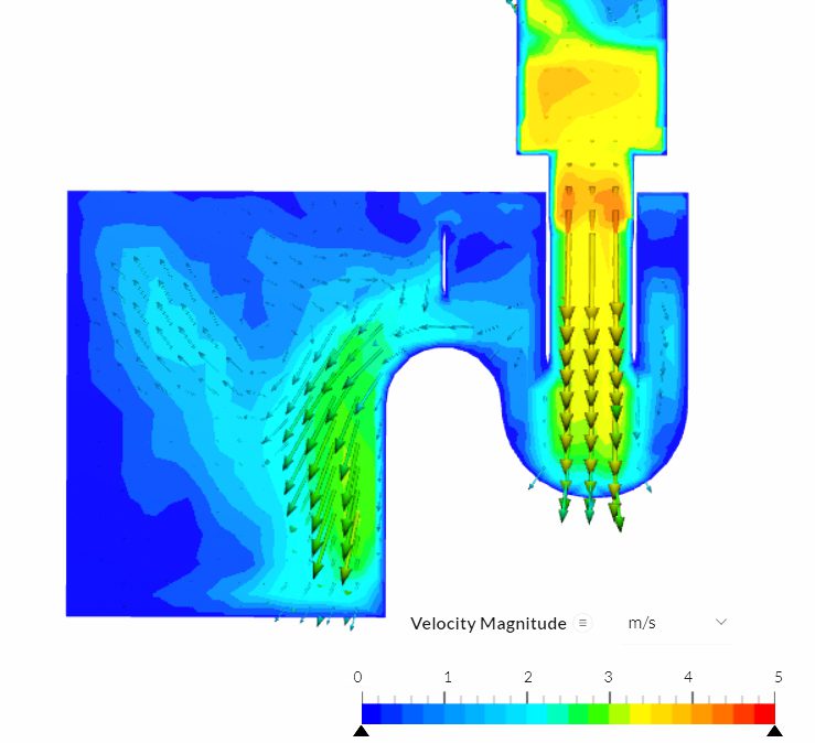 An initial concept was to have a simple collection box for the slurry with a pipe outlet. CFD simulations in SimScale showed that the pipe outlet does not flow well enough and that the box fills up too quickly. The low flow velocities in the pipe would cause particle settling and testing various transition sections from box to pipe does not improve the flow significantly.