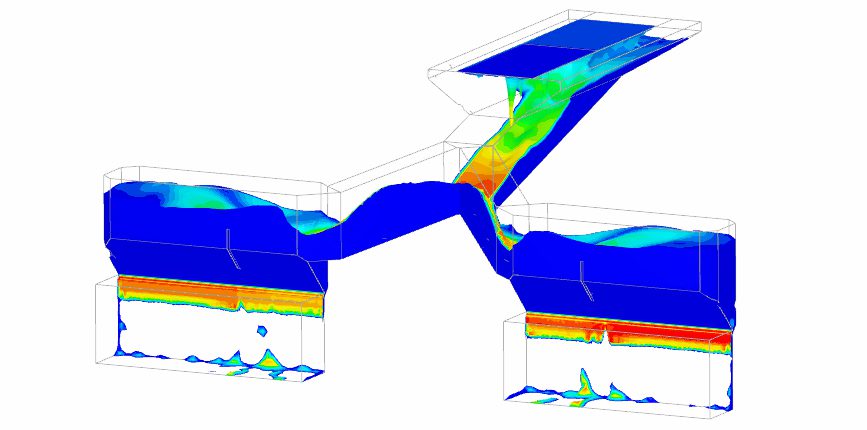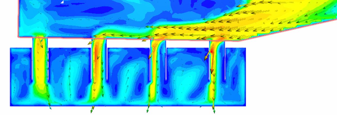 An initial concept for the screen feed box was a typical collection box with down pipes to distribute feed to a boil box with an overall weir to the screen. A spreader plate was used to evenly distribute the screen feed. This concept had a number of variables simulated and it was found that the momentum of the feed was too high and induced a surge flow at the end of the collection box. There was also an uneven feed to the downpipes resulting in uneven particle distribution feed to the screen. Low velocities would also result in the particles settling and blocking the chambers. There was insufficient gravity head available to overcome the challenges of this type of design.