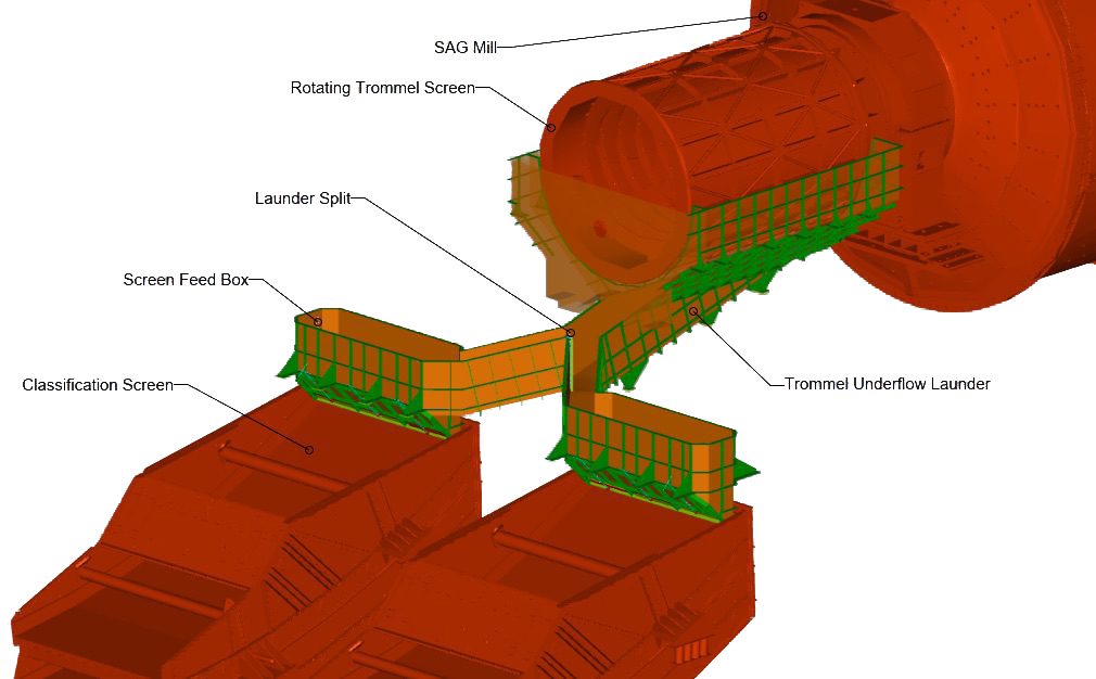 A SAG mill is used to grind and crush large pieces of rock into smaller pieces of rock, gravel, or dust. It is commonly used in the mining industry. An efficient way to transport this crushed material for further processing is as slurries in an open channel, called launders. Launders are subject to intense wear and tear from the slurries and are sensitive to the design as they utilize gravity for flow. The design of a launder is paramount to its flow efficiency, maintenance costs, and hence lifetime operation. A recent project required gravity laundering of iron ore slurry needing high velocities to keep dense iron ore particles in suspension during flow. The outlet onto the screens needed to be well mixed and uniformly distributed across wide screen decks. The design was constrained by the available gravity head and that the flow needed to be split.