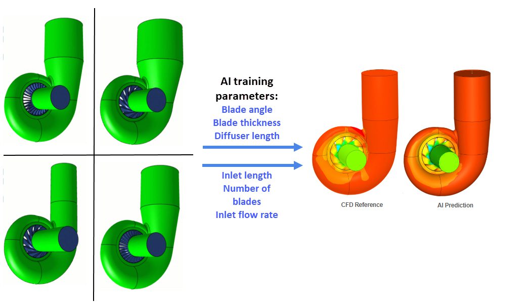 Consider the following AI trained example model of a Centrifugal pump. Running over hundreds of parallel simulations with geometry variations in the number of blades, blade thickness, etc. and variable inlet flow rates predicted CFD results within seconds for new user inputs with accuracy up to 99% and above.