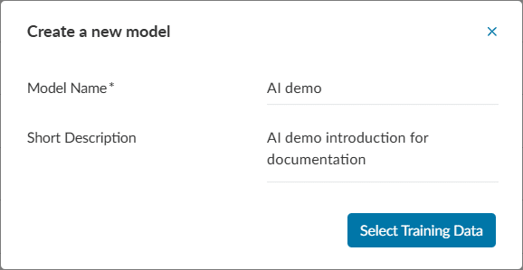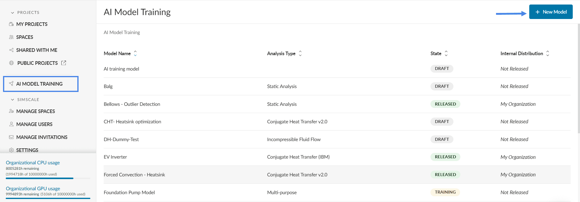 In order to train a new AI model, go to the AI model training page (see left menu in Figure 2) and click on the top right button ‘+ New model’.