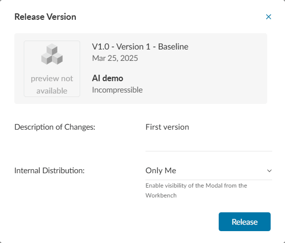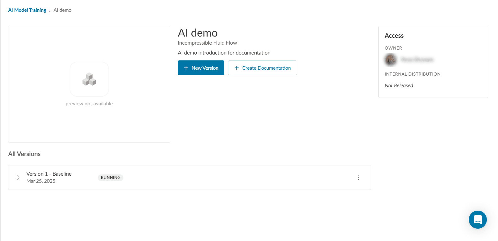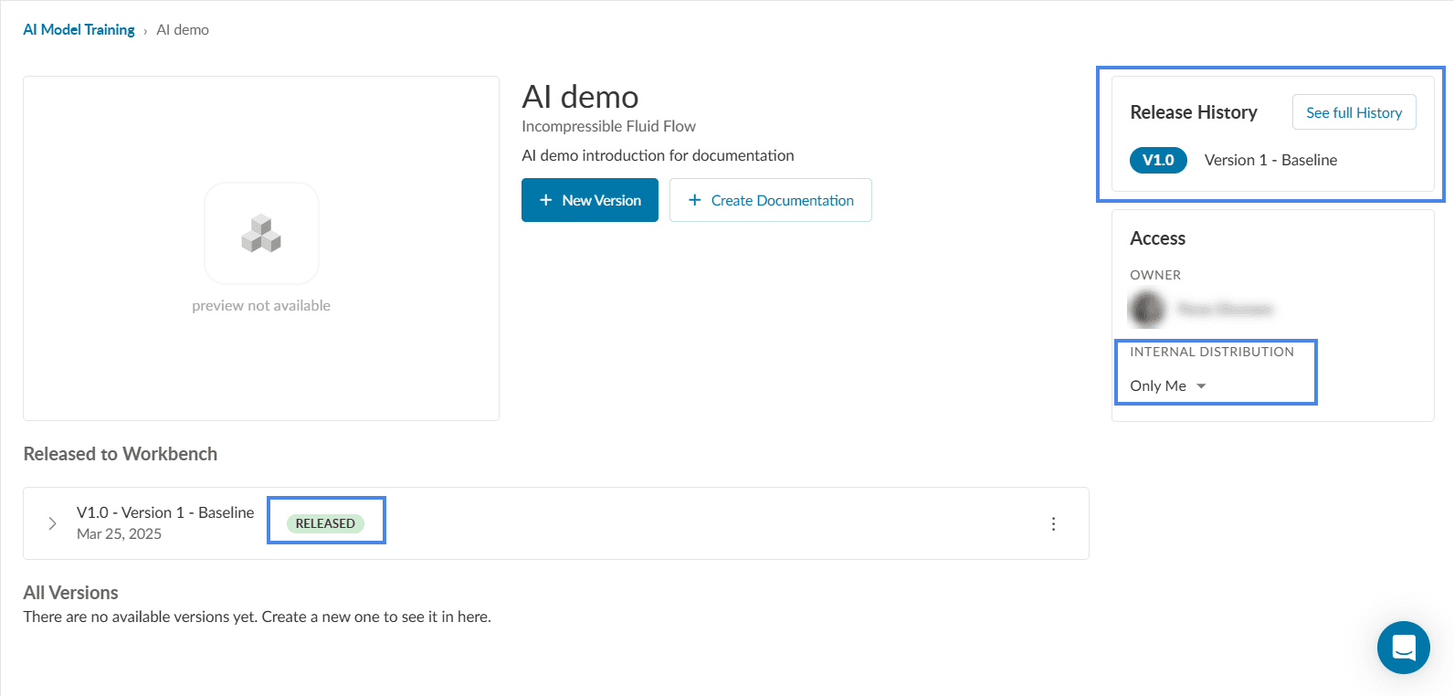 Once the trained model version is released to Workbench the AI Model Training page shows the release status and the type of internal distribution.
