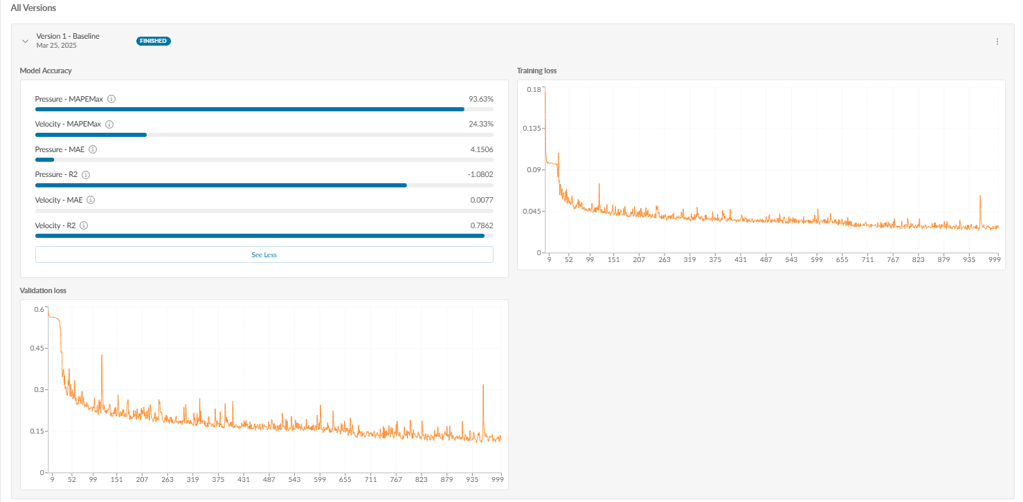 Let’s understand the metrics using the figure above. The MAEPMax for pressure is 93.63 %; however, for velocity it is under 24.33 %. This means the AI model can be used for predicting velocity values with a lower degree of error.